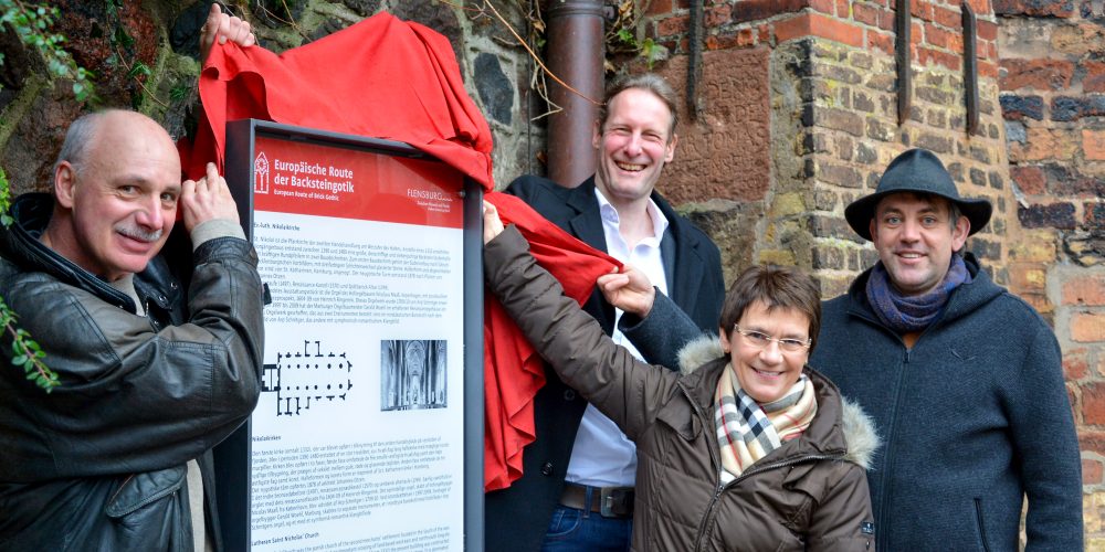 weiter lesenPhoto, from left to right: Monument curator and European Route of Brick Gothic Association board member Eiko Wenzel, Tourism Manager Gorm Casper (from the Flensburger Förde tourism agency), Pastor Sylvia Fuchs from St. Mary’s, Pastor Dr Marcus Friedrich from St. Nikolai Cathedral. The information boards in the design of the European Route of Brick Gothic […]